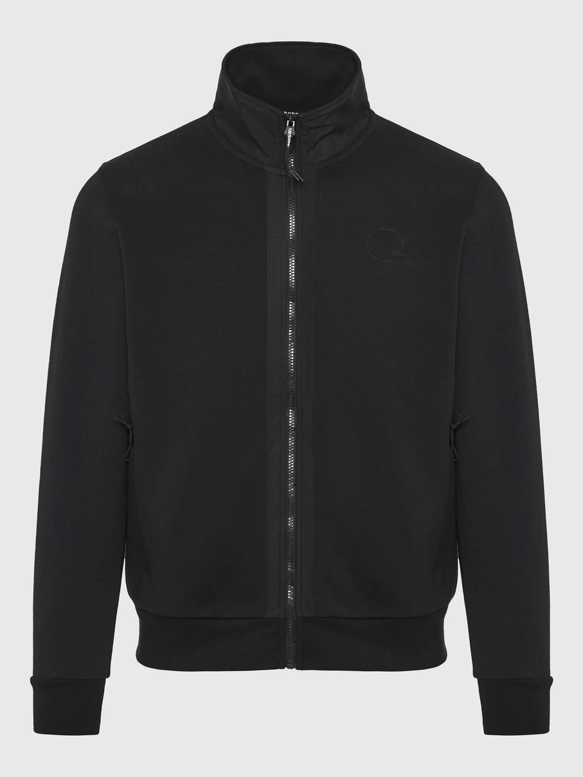 Μαύρη ανδρική ζακέτα με κανονική εφαρμογή και καλυμμένο πίσω μέρος, ιδανική για φθινόπωρο και χειμώνα. Διαθέτει μονοχρωματικό σκούρο τόνο και funnel neck, κατασκευασμένη από φυσικές ίνες και βαμβακερό μείγμα με twill ύφανση. Με μήκος μέχρι τους γοφούς, μακριά μανίκια με ελαστικές μανσέτες και ίσια γραμμή, κλείνει με φερμουάρ για εύκολη εφαρμογή. Συνδυάστε τη με casual παντελόνια ή joggers και sneakers για μια χαλαρή, σύγχρονη εμφάνιση.